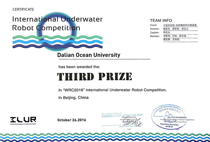 近日,由北京市人民政府、工业和信息化部、中国科学技术协会主办,中国电子学会、北京市经济和信息化委员会、北京经济技术开发区管委会承办的2016年世界机器人大会(大赛)圆满结束。由公司教师缪新颖、崔新忠、林远山,员工王炳州、孙旭、郝志强、曹后阳、王明阳组成的海参捕捞机器人参赛队获得第九届国际水中机器人大赛三等奖。