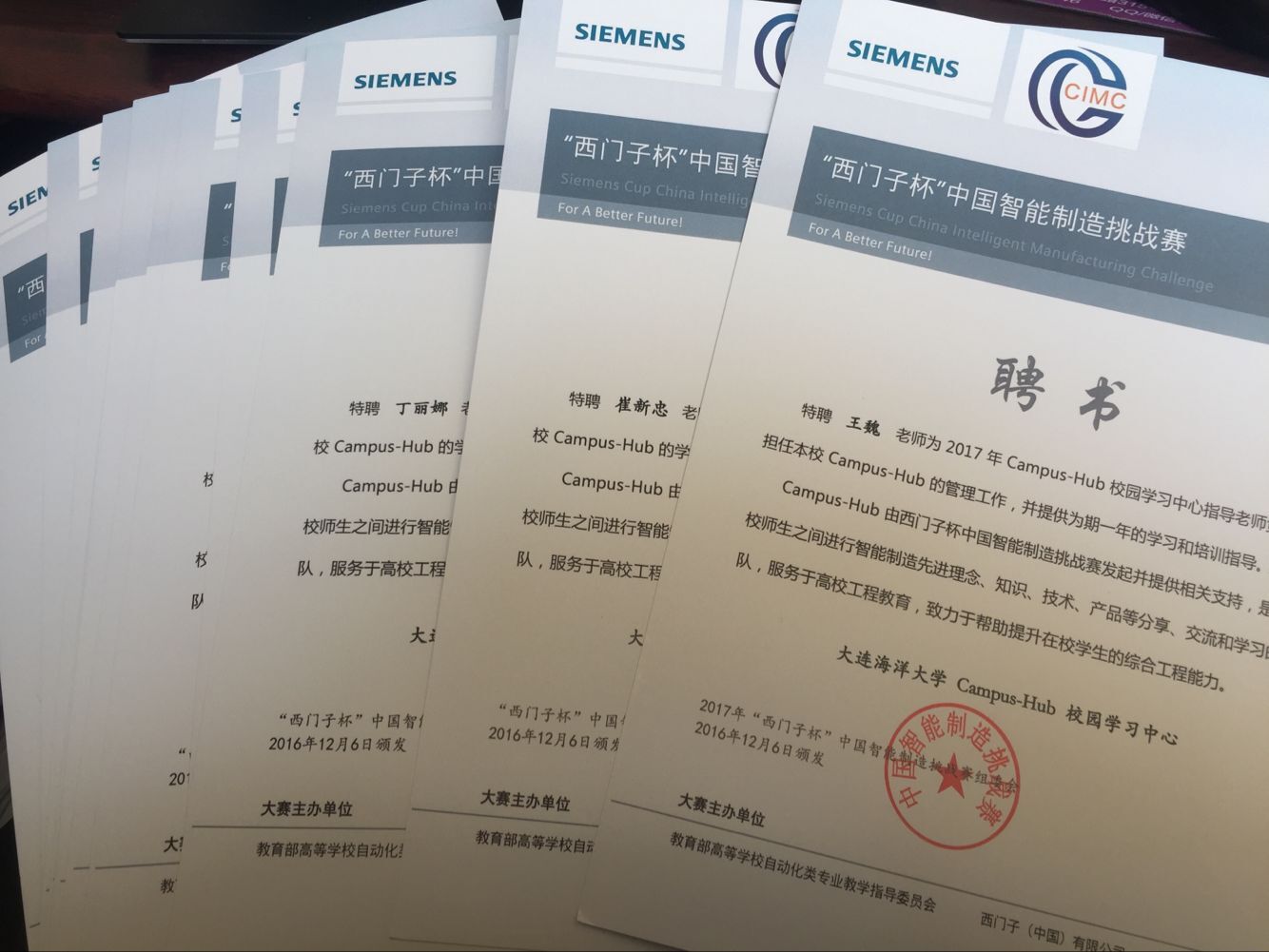 “西门子杯”中国智能制造挑战赛(原全国老员工工业自动化挑战赛)组委会为增强高校员工对工业技术的热爱,更好地帮助老师和同学们参与、完善大赛,在全国各大高校设立Campus-Hub校园学习中心。经申请,公司于12月6日通过审批并获得证书,设立Campus-Hub校园学习中心,指导教师负责人王魏、缪新颖、崔新忠、丁丽娜等获发中心指导教师聘书,员工负责人张康获得聘书。