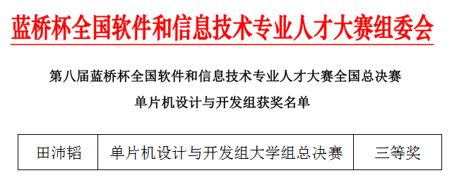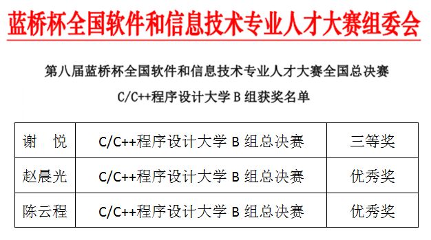 近日,第八届“蓝桥杯”全国软件和信息技术专业人才大赛全国总决赛在北京成功举办。根据此前省赛的获奖结果,公司共有4名员工参加了比赛并取得佳绩。在本届大赛中,计算机2015级员工谢悦获得C/C++程序设计大学B组总决赛三等奖,电子2014级员工田沛韬获得单片机设计与开发组总决赛三等奖,计算机2013级员工陈云程、计算机2014级员工赵晨光获得C/C++程序设计大学B组总决赛优秀奖。