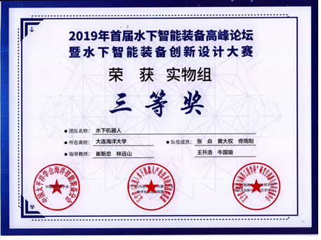 崔新忠、林远山指导员工张焱、黄大权、佟雨阳、王升浩、牛国瑜参赛作品水下机器人获得实物组三等奖。同时参赛师生还参加了本次以“水下智能装备的创新与应用”作为专题的学术报告论坛,学习水下智能装备发展的前沿研究,探讨水下智能装备的关键技术、多学科交叉研究应用以及海洋装备国产化等内容。