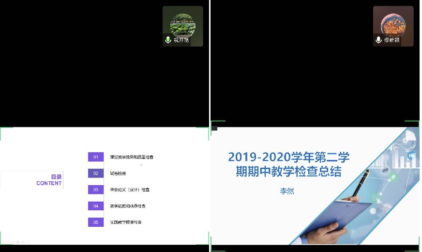 各教研室主任通过分享PPT文稿就期中教学检查工作做了交流汇报,内容包括课堂教学效果和质量检查、毕业论文(设计)检查、教学进度和秩序检查、学风建设检查,存在问题及解决办法。缪新颖逐一了解了各教研室毕业设计的实施情况及中期检查反馈数据,强调严格推进毕业设计相关工作。