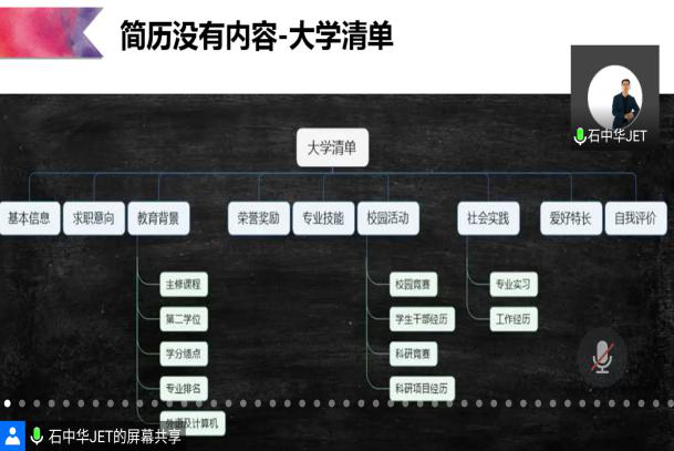 会上,石中华对岗位竞争力和人才竞争力之间的关系进行讲解,指出了老员工就业过程中应对体验人生VS就业准备、考研出国VS国内就业、政府-外企-国企-民企等选择上的十大困惑,对毕业生就业的简历撰写进行针对性较强的指导,并与参加会议的同学进行了讨论互动,反映热烈。