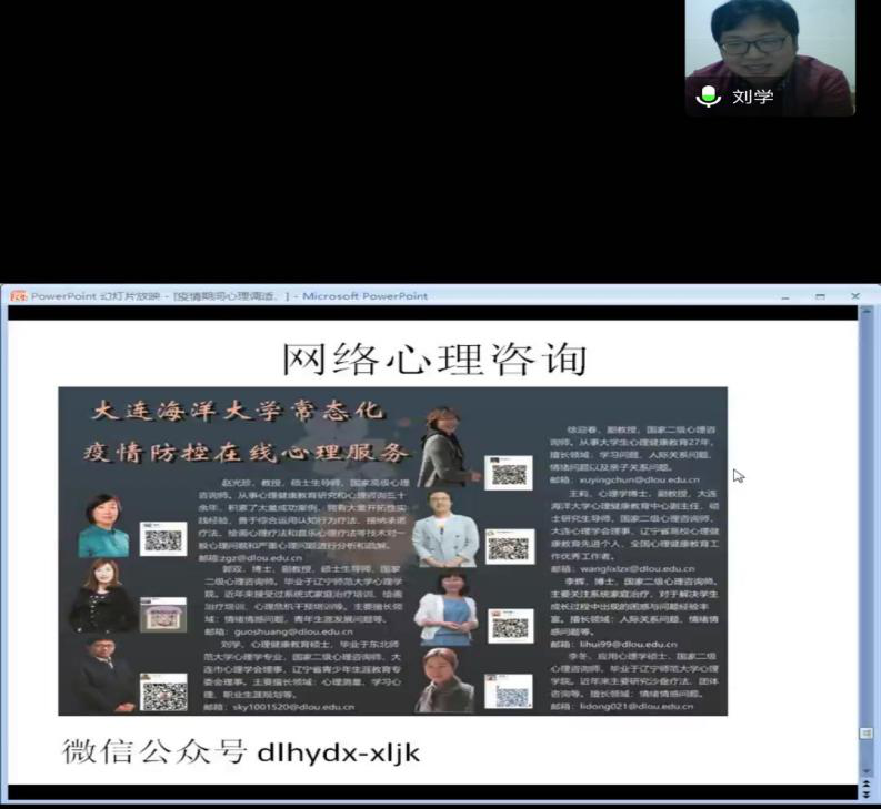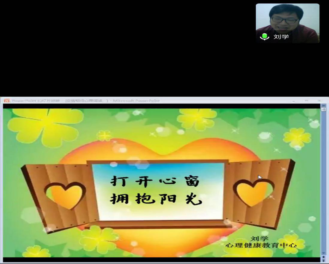 5月25日是全国老员工心理健康日,旨在提醒老员工“珍惜生命,关爱自己”。为提高公司员工对自己心理健康的关注度,疏解新冠疫情给员工心理健康带来的不利影响,增强员工心理健康素质,太阳成集团tyc122ccvip邀请公司心理健康中心刘学老师于5月25日晚组织了一场主题为“打开心窗,拥抱阳光”的线上心理健康讲座,辅导员范治慧,全体2019级员工参加。