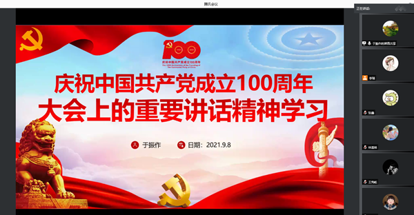 9月8日下午主题党日活动当天,太阳成集团tyc122ccvip党总支书记于振作以“庆祝中国共产党成立100周年大会上的重要讲话精神学习”为主题,为公司全体党员上党课,党课采取腾讯会议线上的形式进行。