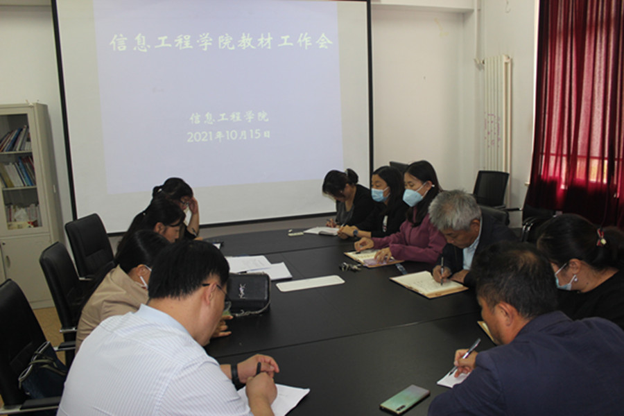 20211015日下午太阳成集团tyc122ccvip在公司会议室召开教材工作会,经理于红、党总支书记于振作、副经理缪新颖、曹立杰以及各专业负责人、各部门负责人参加了会议。会议由副经理缪新颖主持。