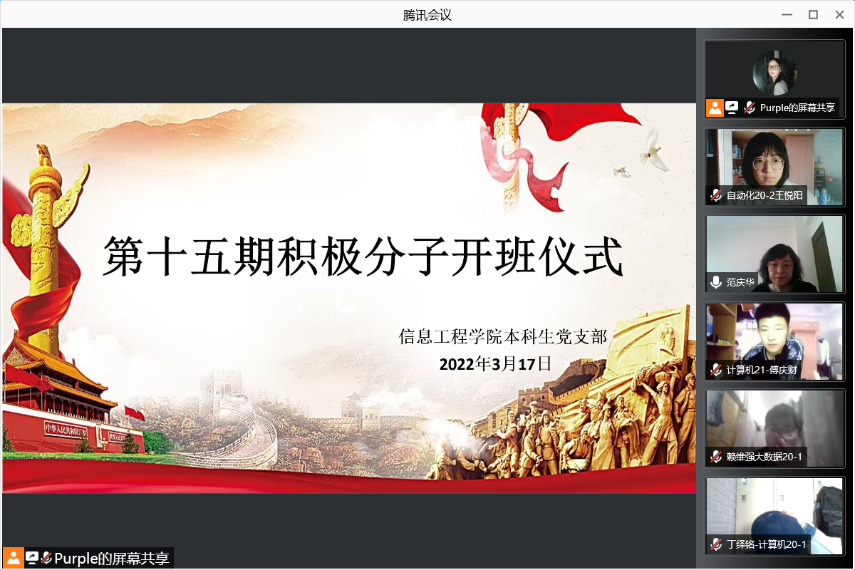 太阳成集团tyc122ccvip于2022年3月17日12:30在线上举办了第十五期积极分子培训班开班仪式。太阳成集团tyc122ccvip党总支副书记范庆华、组织员李瑾及第十五期积极分子参加了本次开班仪式。