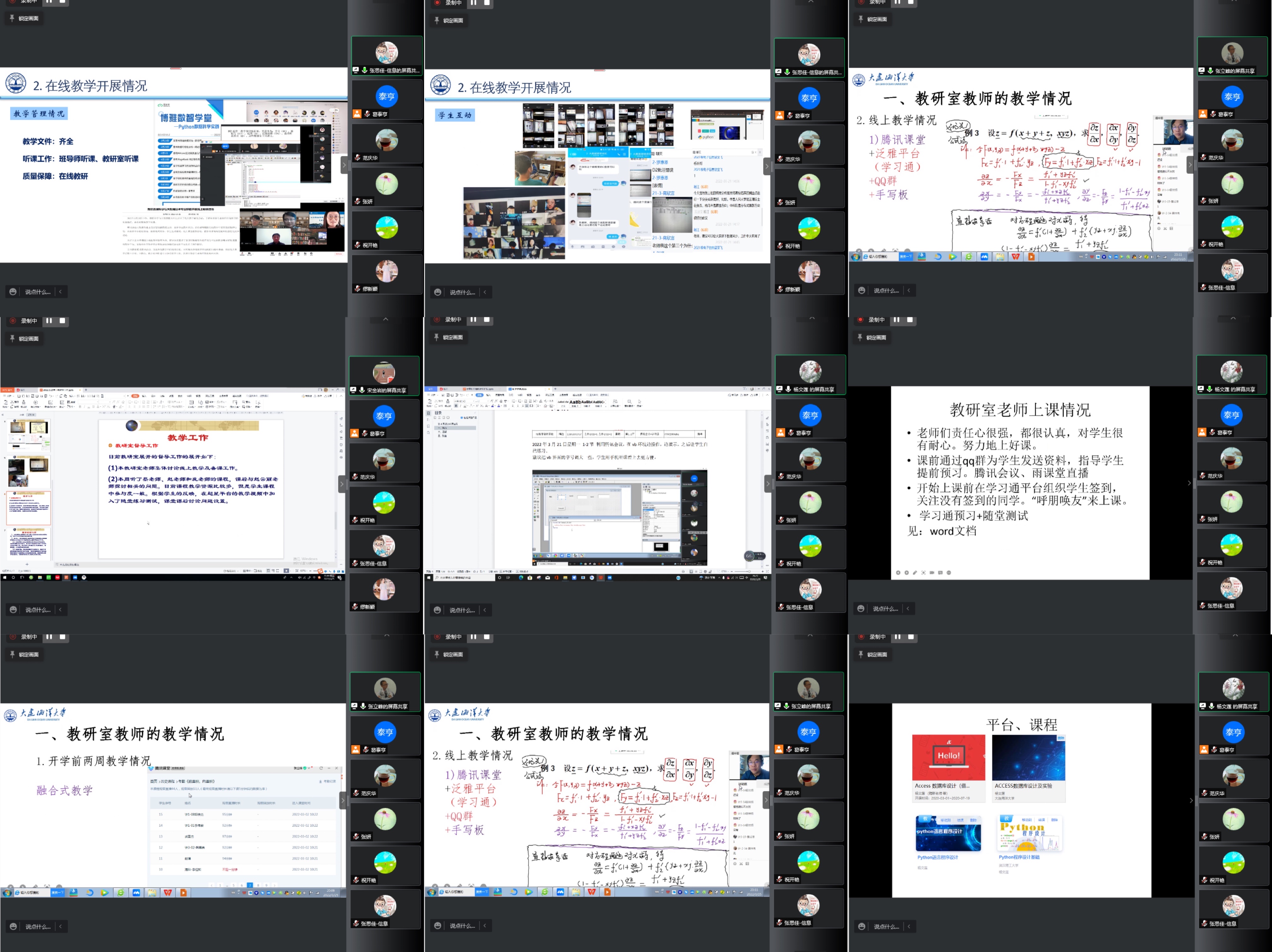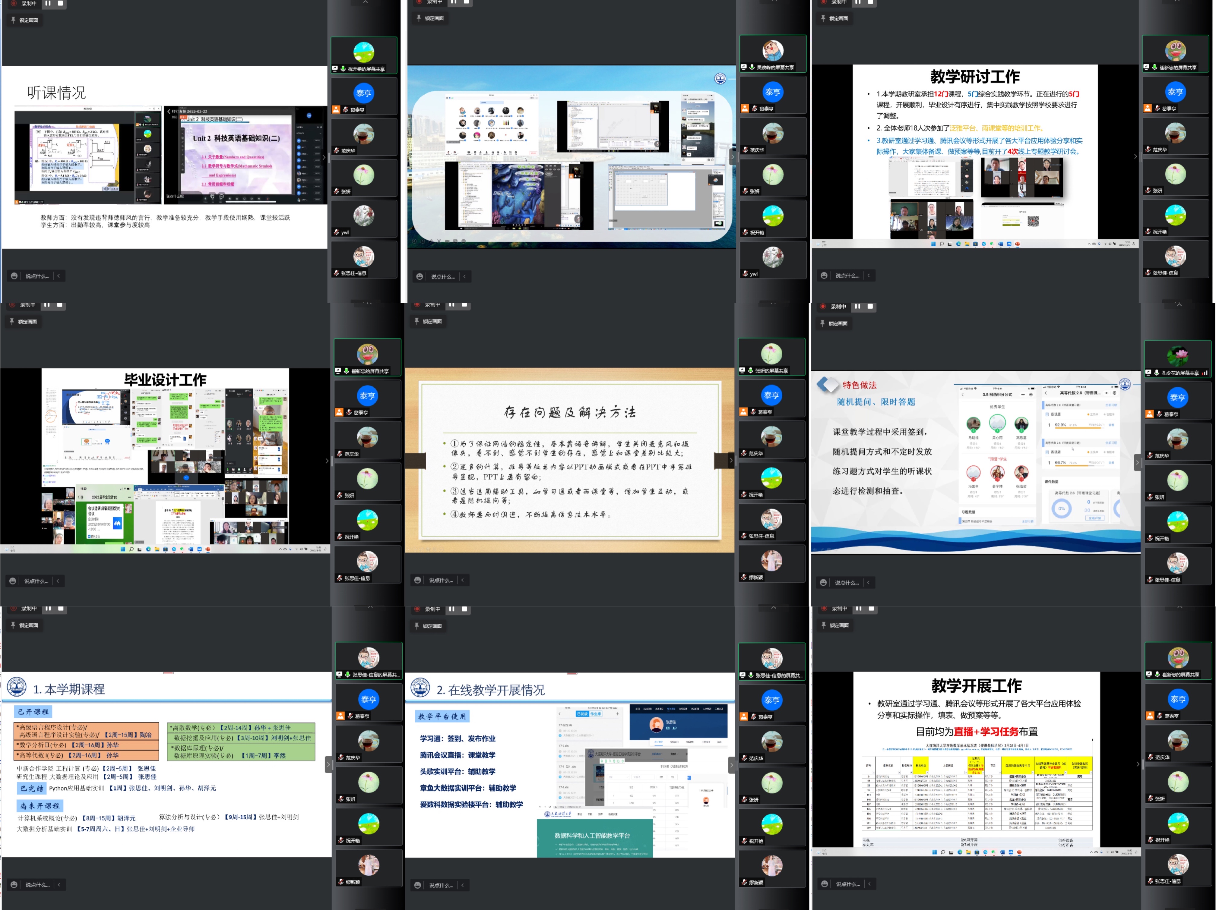 各教研室主任就在线课程建设、课堂实践教学、在线教学过程考核方式、教学效果及教学反馈、出勤及作业提交率、存在的问题及解决办法等;师生互动的方式方法、课程思政、教学平台、网络和设备等;本科毕业设计对员工进度情况、交流指导方式与频次、问题员工关注、进度困难员工解决办法、毕业设计管理及预案等主题逐一进行汇报和开放交流。