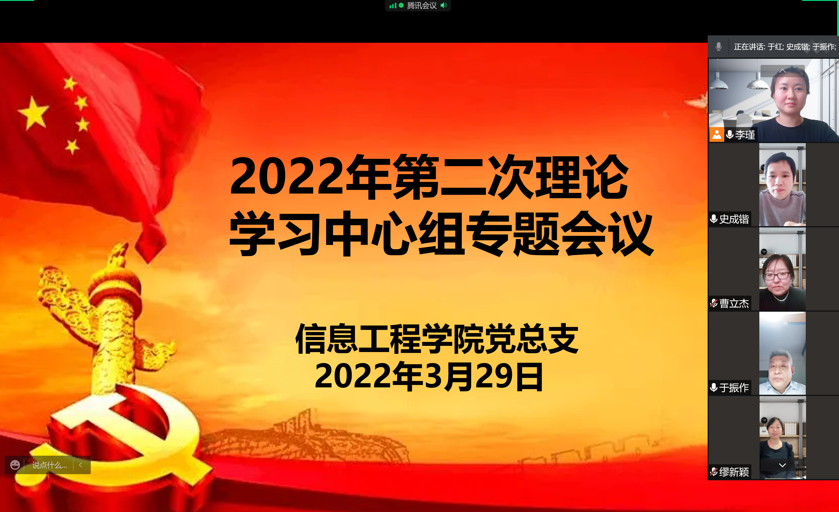 3月29日,太阳成集团tyc122ccvip党总支在腾讯会议线上召开了2022年第二次理论学习中心组专题学习会议,本次会议由党总支书记于振作主持,理论中心组全体成员参加了会议。