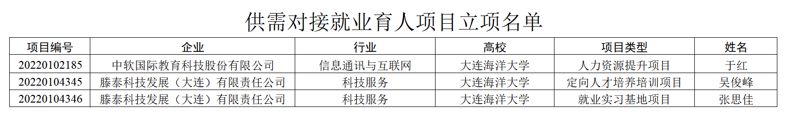 近日,教育部高校员工司发布了《教育部高校员工司关于公布第一期供需对接就业育人项目立项名单的通知》(教学司〔2022〕7号),公司与中软国际教育科技股份有限公司、滕泰科技发展(大连)有限责任公司等企业合作的3个就业育人项目获批立项。