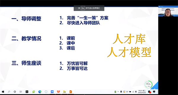 为满足部分同学的现实需求和意向选择,大会首先向全体同学公布了新一轮专业完全导师双选调整名单,并对后续工作进行了安排部署;其次,向全体同学通报了专业教师在本学期在线听课、巡课中发现的问题,对员工们提出的问题进行了耐心细致地解答;最后,张思佳老师指出,各位导师要尽快完善新的“一生一策”方案,调整的同学要尽快融入新导师团队,同时希望全体同学善于发掘自身优势,规划好老员工活,严于律己,形成合力,以取得更大的进步。