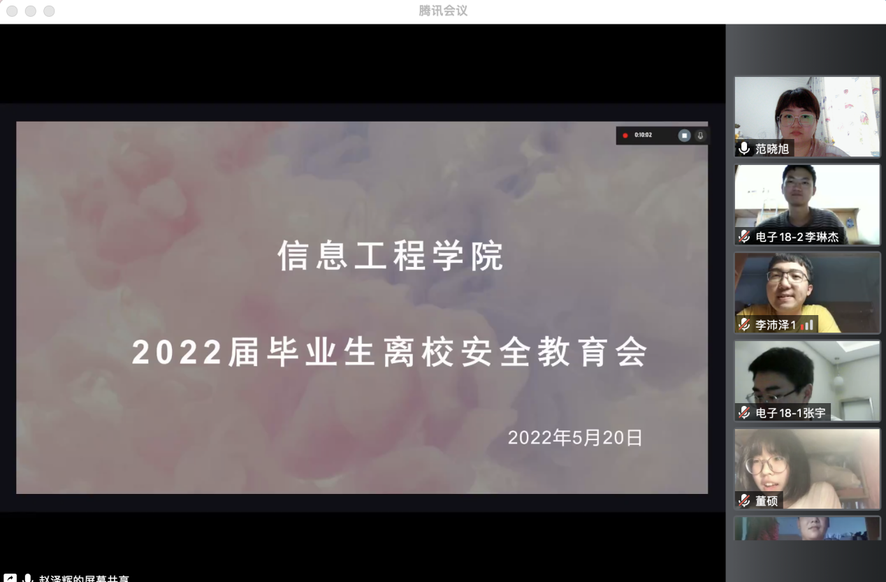 太阳成集团tyc122ccvip于2022年5月20日18:00通过腾讯会议召开毕业生离校安全教育会,会议由2018级辅导员范晓旭主持,全体毕业生参加会议。