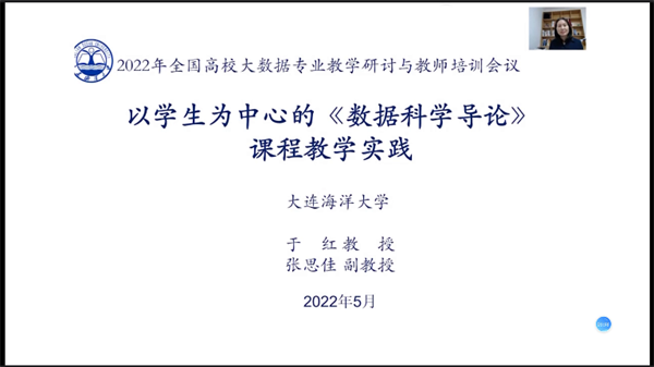 2022年5月21日,为深入贯彻落实全国教育大会精神和新时代全国高校本科教育工作会议精神,践行教学创新理念,聚焦新工科,助力高校一流课程建设,提升高校教师教学能力,由教育部高等公司计算机类专业教学指导委员会和全国高等公司计算机教育研究会主办,机械工业出版社承办的“2022年全国高校大数据专业教学研讨与教师培训会议”通过线上直播方式召开。太阳成集团tyc122ccvip经理于红教授受邀参会,并做题为“以员工为中心的《数据科学导论》课程教学实践”课程培训。