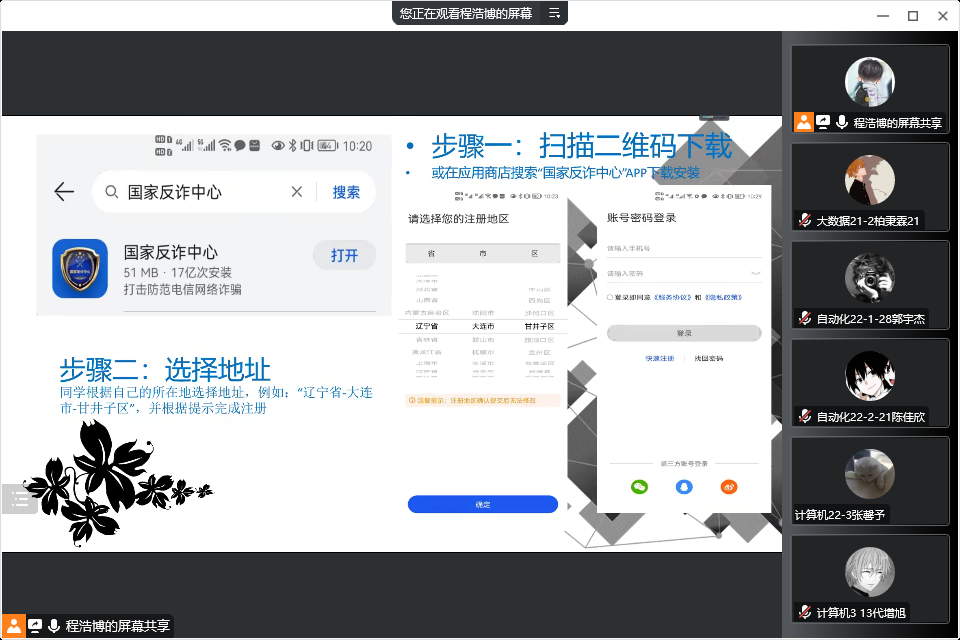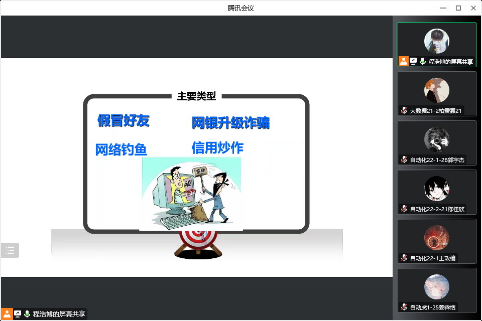 近年来,随着通讯技术的发展及多样化,电信诈骗手段和形式也开始呈现出多样化趋势。太阳成集团tyc122ccvip于202210221700开展了线上校园反诈骗安全学习讲座,本次讲座由员工会副主席程浩博主持,2022级全体新生出席。