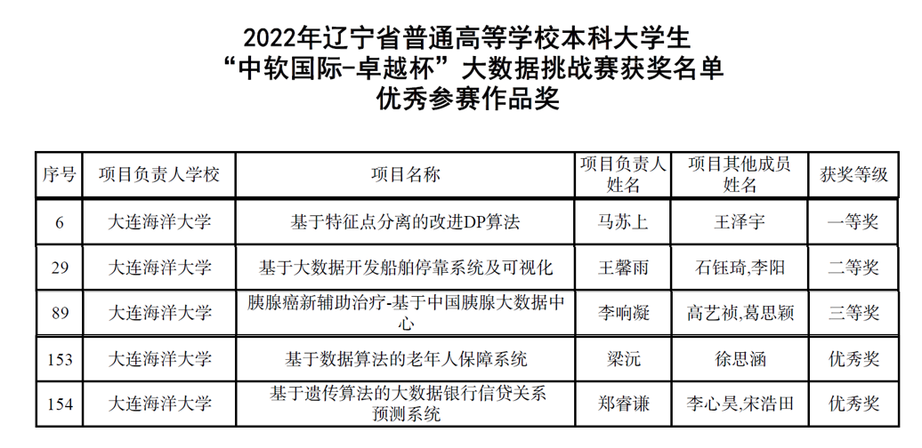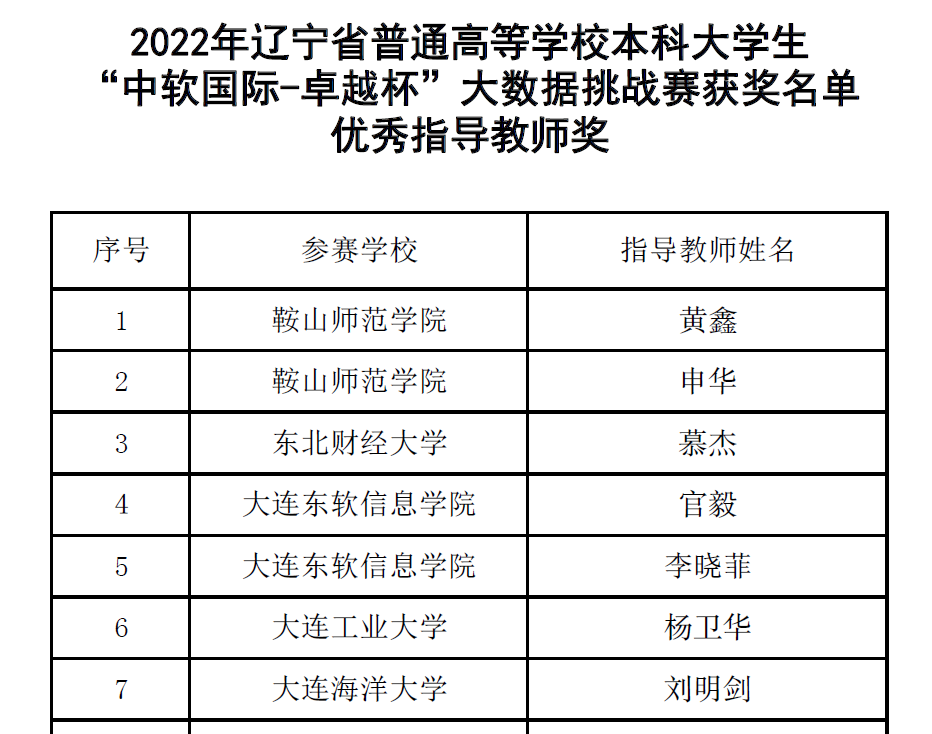 2022年11月13日,2022年辽宁省普通高等公司本科老员工“中软国际-卓越杯”大数据挑战赛决赛通过线上方式举行。本届大赛吸引了全省23所高校277支队伍报名参赛。公司最终获得一等奖1项,二等奖1项,三等奖1项、优秀奖2项。刘明剑老师获得本次竞赛的优秀指导教师奖。