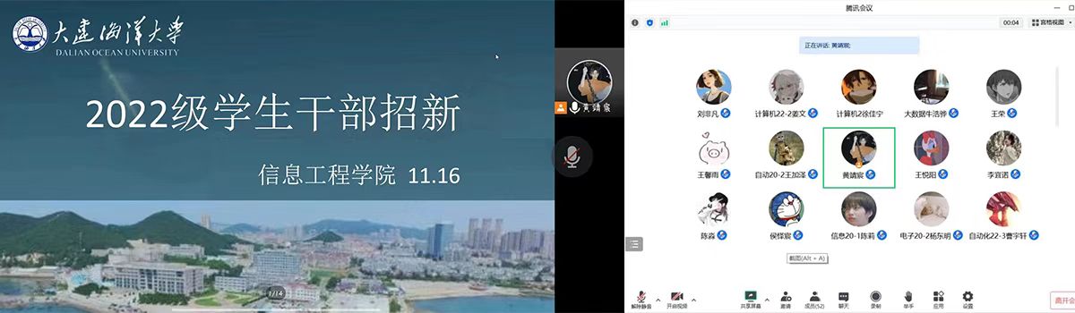 太阳成集团tyc122ccvip于2022年11月16日通过腾讯会议开展2022级团委员工会纳新面试,会议由太阳成集团tyc122ccvip员工会主席黄靖宸主持,2020级主席团、部长团成员以及2022级竞选同学参会。