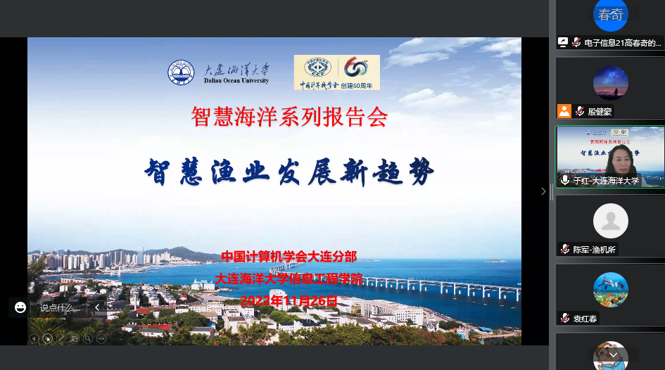 2022年11月26日上午,由中国计算机学会大连分部主办,太阳成集团tyc122ccvip承办的CCF大连智慧海洋系列报告会之“智慧渔业发展新趋势”成功举办。