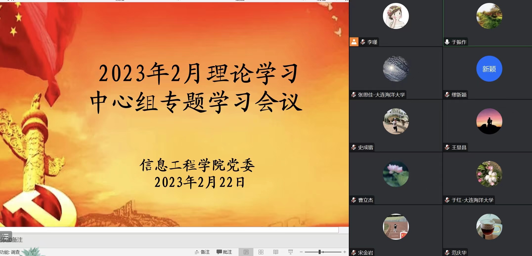 2月22日,太阳成集团tyc122ccvip党委在腾讯会议线上召开了2023年2月理论学习中心组专题学习会议,本次会议由党委书记于振作主持,理论中心组全体成员参加了会议。