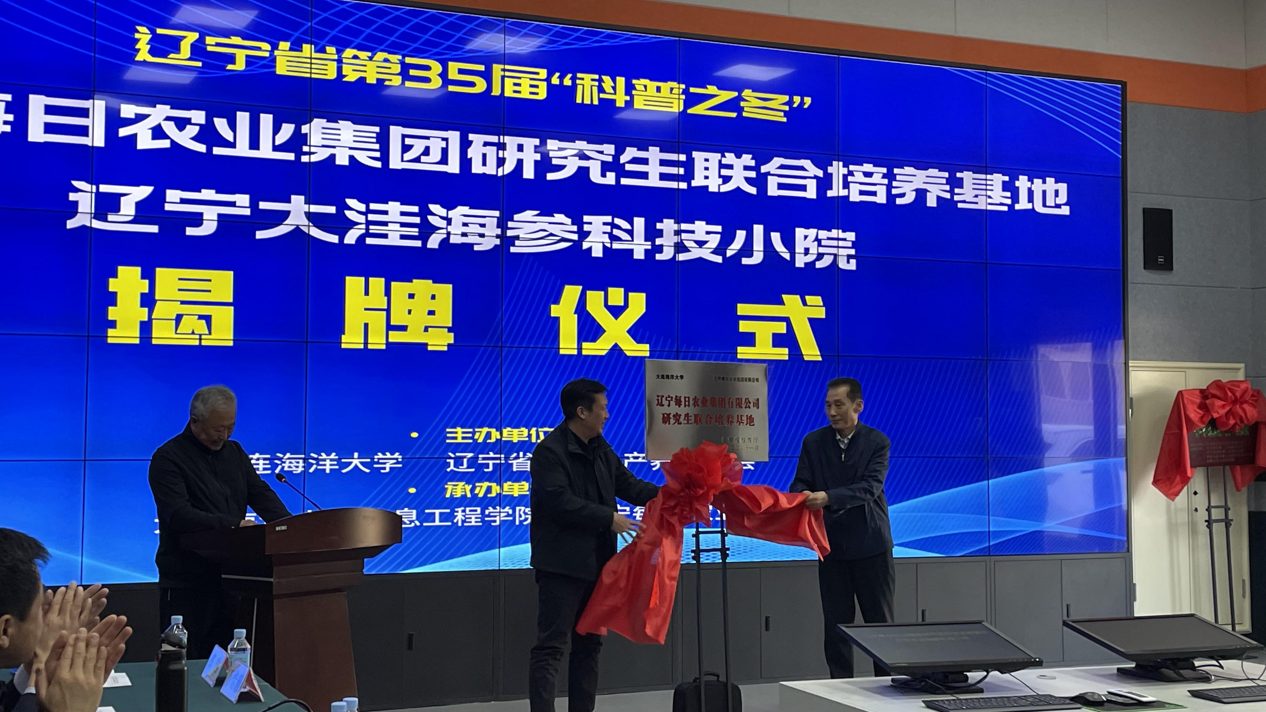 3月15日,公司与辽宁每日农业集团有限公司举行“辽宁每日农业集团研究生联合培养基地”揭牌仪式。公司党委研究生工作部部长邓立志、辽宁每日集团董事长张玉满出席活动并讲话,公司太阳成集团tyc122ccvip经理于红、副经理曹立杰及相关老师、中国渔业协会河蟹分会秘书长韩英林、辽宁每日农业集团有限公司、辽宁省海洋水产养殖协会相关人员参加活动。