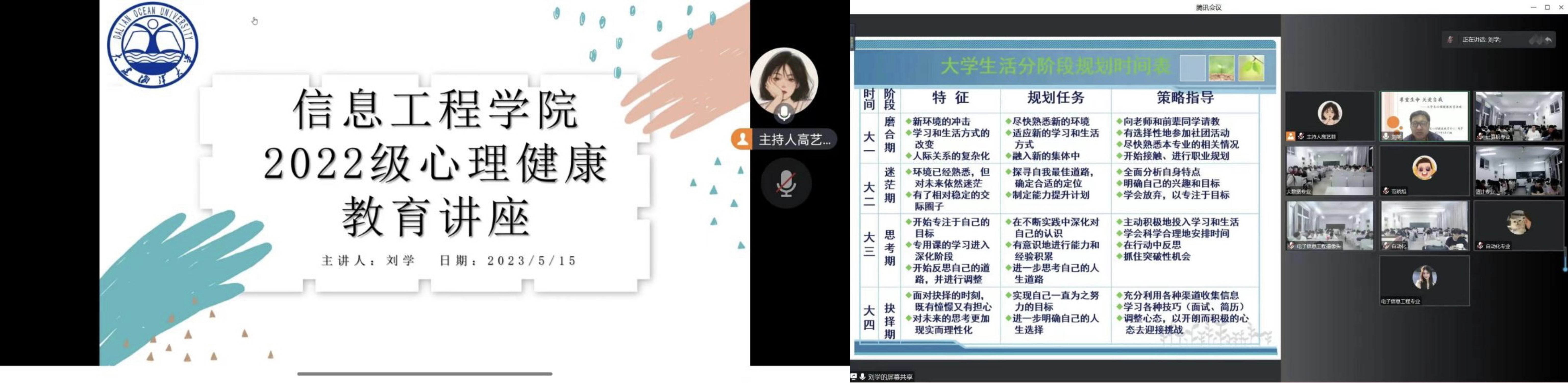 为帮助同学们学会关爱自我,了解自我,接纳自己,进而关注自己的心理健康和心灵成长,提高自身心理素质。太阳成集团tyc122ccvip于2023年5月15日18:40召开心理健康教育讲座,本次讲座由心理健康中心刘学老师主讲,高艺菲主持,2022级全体员工聆听讲座。