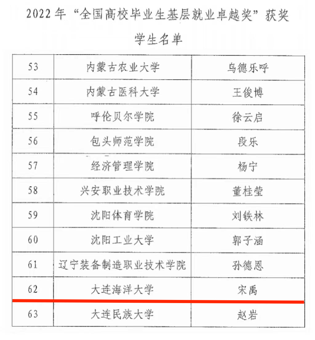 近日,教育部高校员工司印发《关于转发“全国高校毕业生基层就业卓越奖”奖励委员会〈关于公布2022年“全国高校毕业生基层就业卓越奖”获奖人选的通知〉的通知》。公司2019届毕业生宋禹荣获2022年“全国高校毕业生基层就业卓越奖”员工荣誉称号(全国共398名)。
