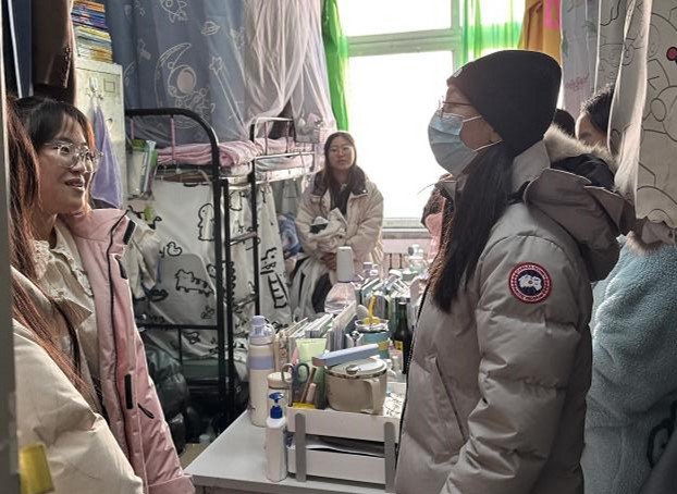 为进一步落实员工寝室安全卫生教育和管理,营造良好的学习生活环境,提升同学们的安全防范意识,引导员工养成良好的生活习惯,2023121212002023级辅导员张萌莎、宋子奇带队进入渤海校区三舍、五舍寝室进行卫生安全大检查,对员工寝室用电安全、卫生、安全隐患等情况进行排查。