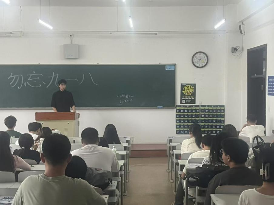 9时18分伴随着沉重的鸣笛声响起,全体肃立,为历史上的这一天默哀,以示对历史的铭记与对和平的珍视。硝烟远去,国殇难忘,牢记国耻,吾辈自强!各班团支书带领同学们回顾了九一八事变的历史过程,重温了中华民族的苦难岁月,每个同学的目光中都透露着对祖国深厚的感情。而后又通过纪录片重温抗战英雄为国冲锋陷阵,不畏生死的气魄,展现了中华民族永不服输的爱国精神,激发了同学们对先辈的敬慕之情。