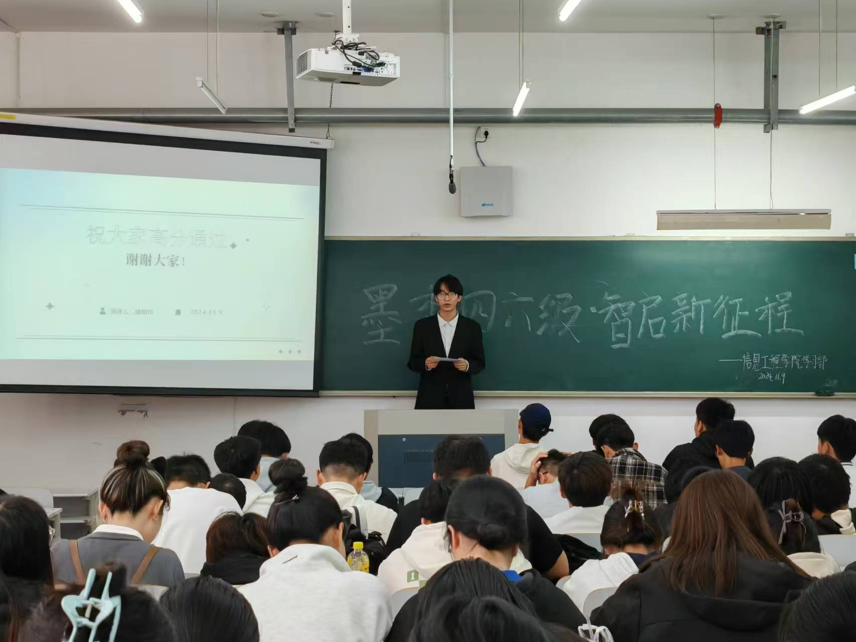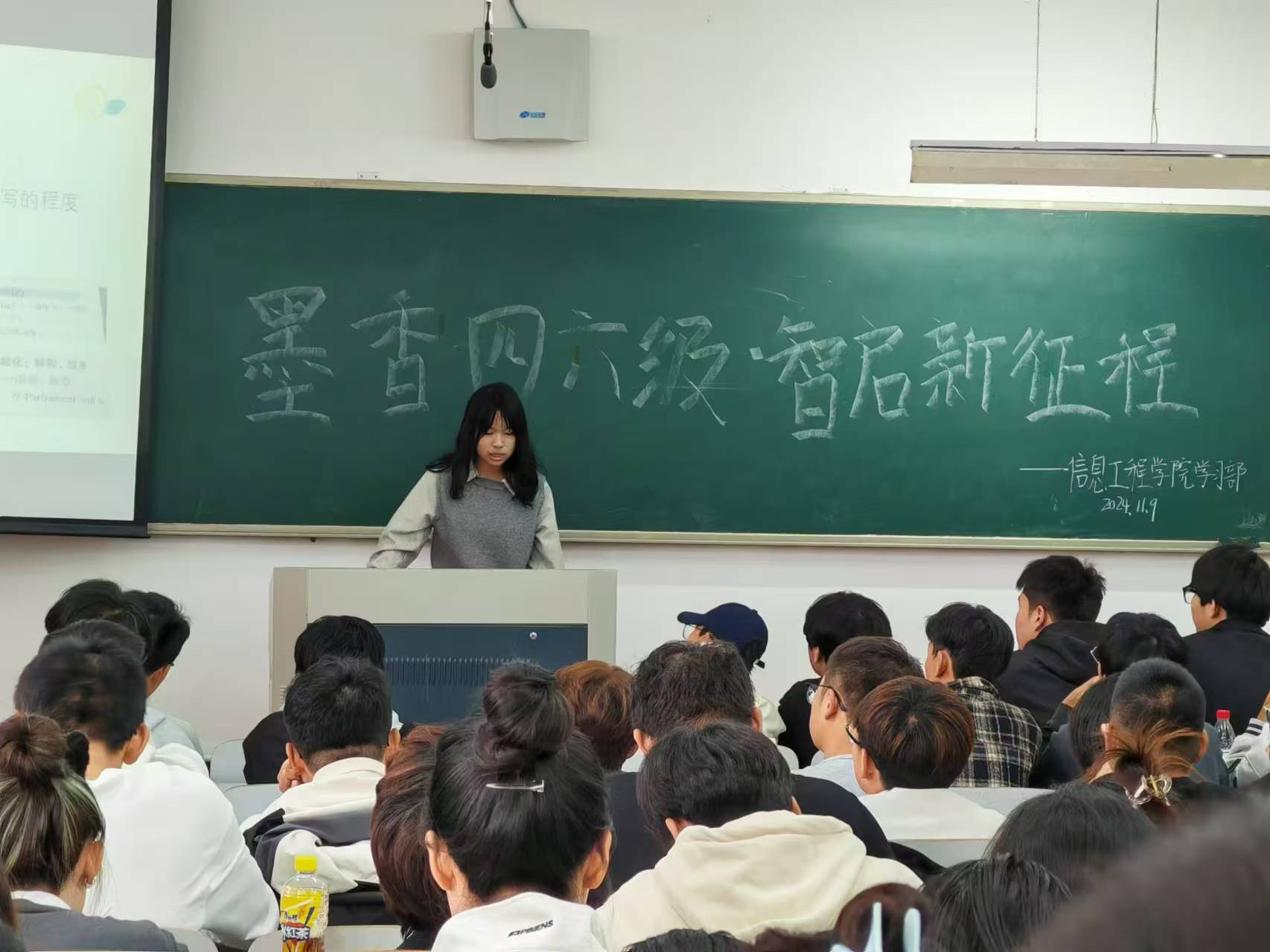 为激发公司学子对英语学习的热情,有效推进英语四六级备考进程,解答备考过程中的种种疑惑,太阳成集团tyc122ccvip于2024年11月9日在獐子岛教学楼125教室举办了“墨香四六级,智启新征程”——四六级经验交流会。会议由王文琪主持。