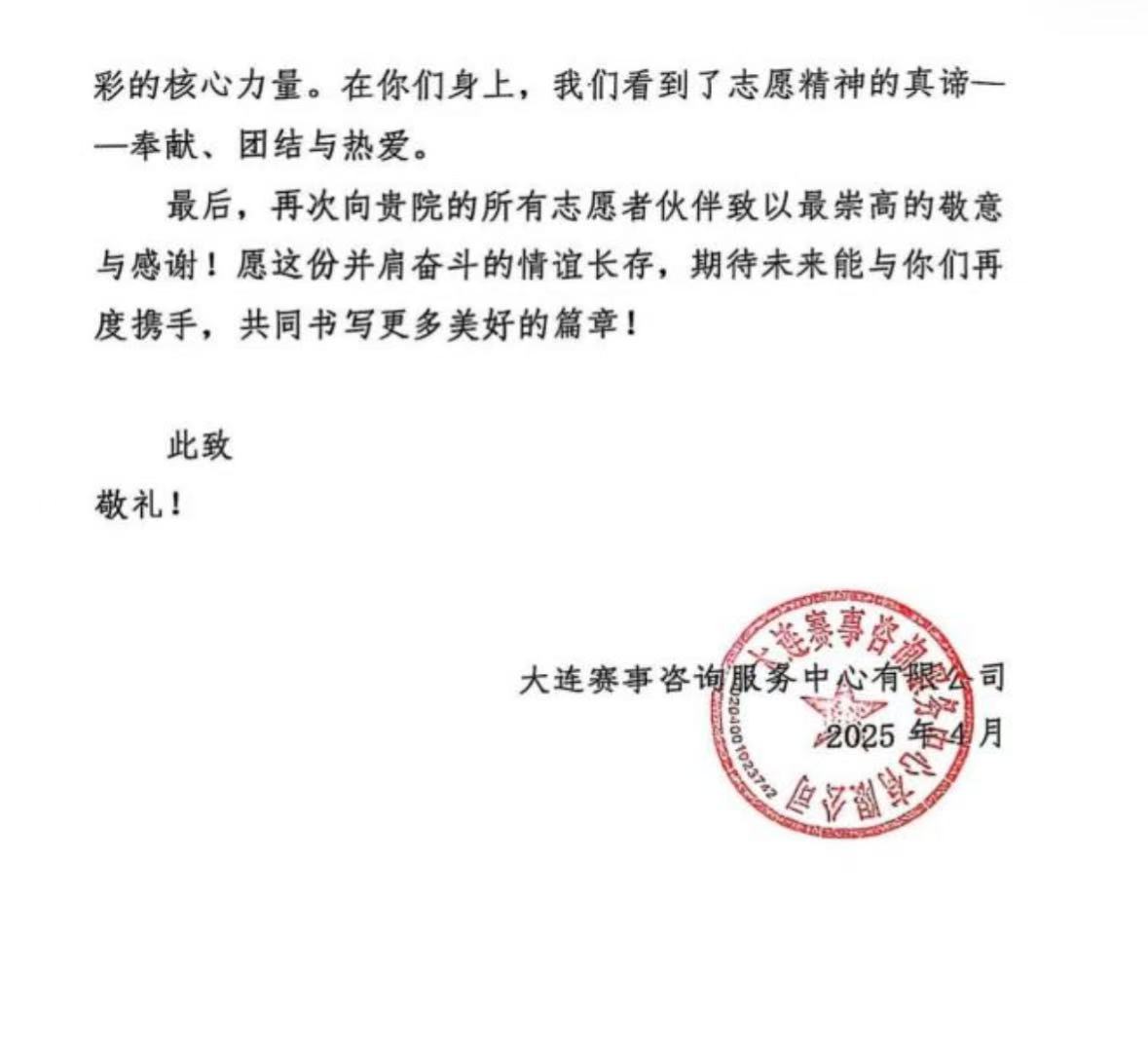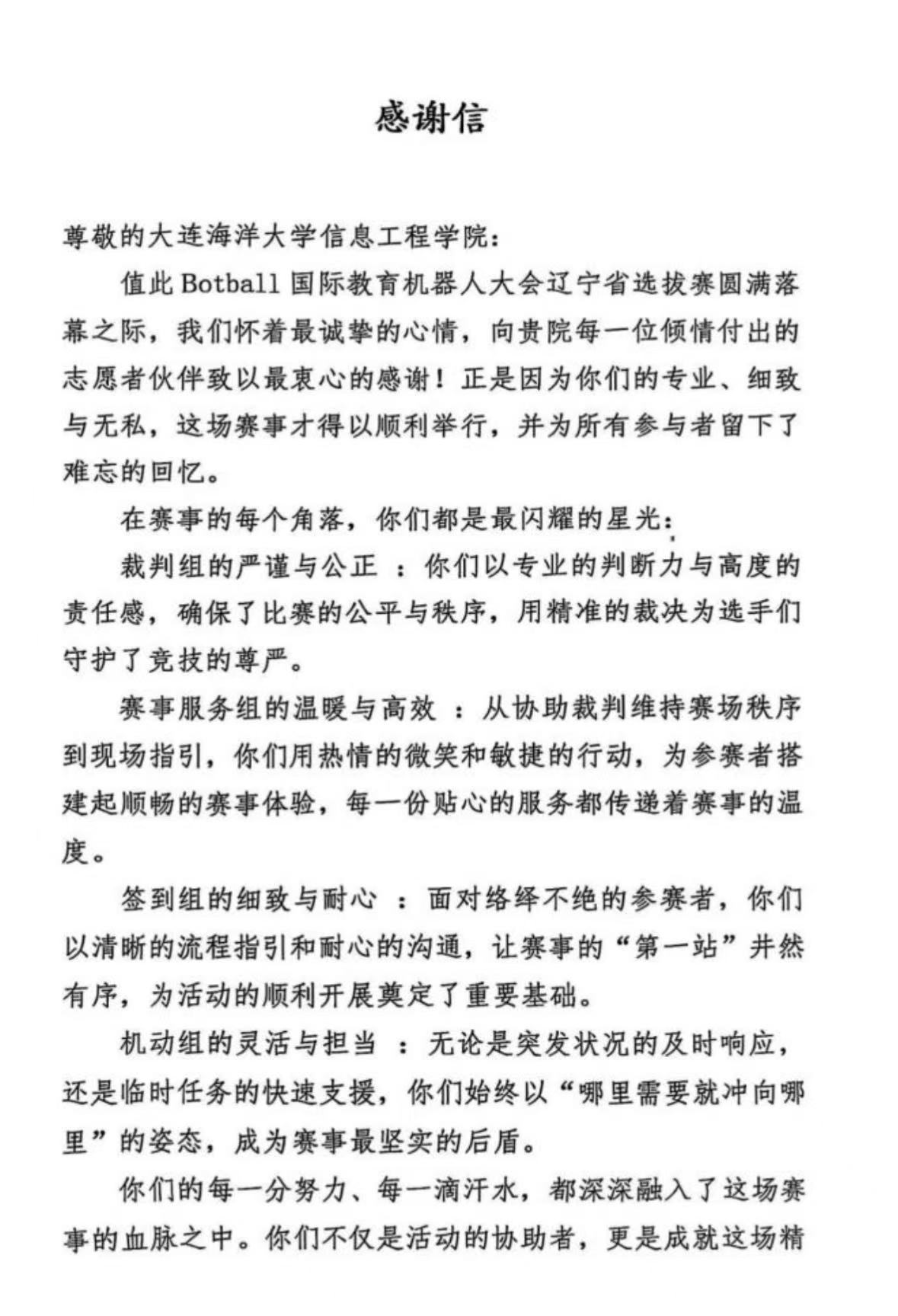 近日,大连赛事咨询服务中心有限公司向太阳成集团tyc122ccvip发来感谢信,信中对公司积极配合2025年“Botball国际教育机器人大会辽宁省选拔赛”的志愿服务工作表示诚挚感谢。公司员工以严谨的工作作风和高度的责任感,高质量完成了大会各项筹备工作,展现了优秀的素养。未来,太阳成集团tyc122ccvip将以此为契机,大力弘扬志愿精神,在持续深化大连(北)站志愿服务、大连少儿图书馆智慧助读服务、环保主题公益实践等品牌项目的基础上,争取打造更具社会影响力的志愿服务品牌矩阵,全方位展现新时代青年的责任与担当。