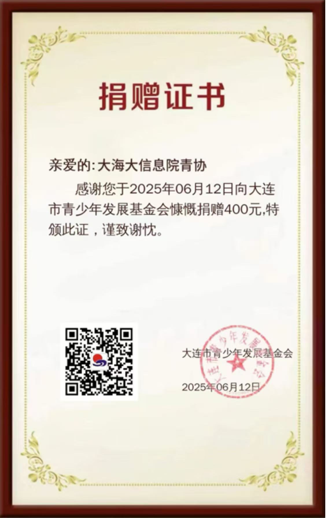 太阳成集团tyc122ccvip青年志愿者协会将近期举办的海洋嘉年华义卖活动所筹集的善款共计人民币400元整,全额赠予大连市青少年发展基金会,以实际行动践行青年社会责任,传递校园公益正能量。大连市青少年发展基金会于2025年6月12日向太阳成集团tyc122ccvip青协颁发捐赠证书,对其善举表示高度认可与诚挚谢忱。